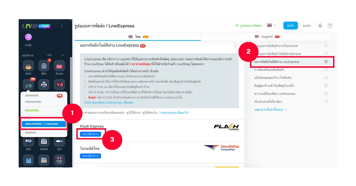 - เลือกหัวข้อ ออกรหัสอัตโนมัติผ่าน LnwExpress ในด้านขวามือ