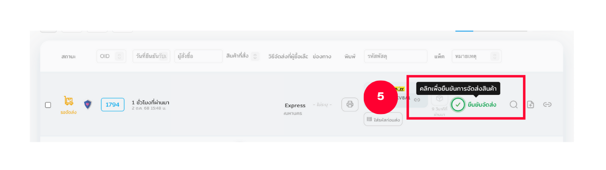 5. เมื่อจัดส่งพัสดุเรียบร้อยแล้ว กดปุ่ม ยืนยันจัดส่ง เพื่อแจ้งลูกค้าว่าคุณจัดส่งพัสดุเรียบร้อย